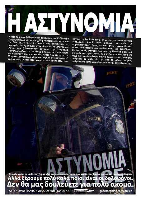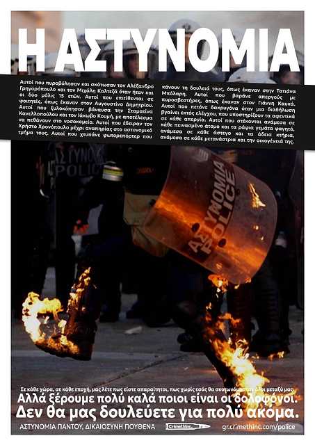 Αυτοί που πυροβόλησαν και σκότωσαν τον Αλέξανδρο Γρηγορόπουλο και τον Μιχάλη Καλτεζά όταν ήταν και οι δύο μόλις 15 ετών. Αυτοί που επιτίθενται σε φοιτητές, όπως έκαναν στον Αυγουστίνο Δημητρίου. Αυτοί που ξυλοκόπησαν βάναυσα την Σταματίνα Κανελλοπούλου και τον Ιάκωβο Κουμή, με αποτέλεσμα να πεθάνουν στο νοσοκομείο. Αυτοί που έδειραν τον Χρήστο Χρονόπουλο μέχρι αναπηρίας στο αστυνομικό τμήμα τους. Αυτοί που χτυπάνε φωτορεπόρτερ που κάνουν τη δουλειά τους, όπως έκαναν στην Τατιάνα Μπόλαρη. Αυτοί που βαράνε απεργούς με πυροσβεστήρες, όπως έκαναν στον Γιάννη Καυκά. Αυτοί που πετάνε δακρυγόνα όταν μια διαδήλωση βγαίνει εκτός ελέγχου, που υποστηρίζουν τα αφεντικά σε κάθε απεργία. Αυτοί που στέκονται ανάμεσα σε κάθε πεινασμένο άτομο και τα ράφια γεμάτα φαγητό, ανάμεσα σε κάθε άστεγο και τα άδεια κτήρια, ανάμεσα σε κάθε μετανάστρια και την οικογένειά της.