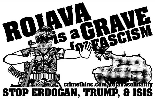 With nationalism growing worldwide, the Turkish invasion of Rojava for the purpose of ethnic cleansing and resettlement is the equivalent of late-1930s German expansionism. This poster celebrates the participation of the anarchist group Tekoşîna Anarşîst (Anarchist Struggle) in the defense of Rojava.